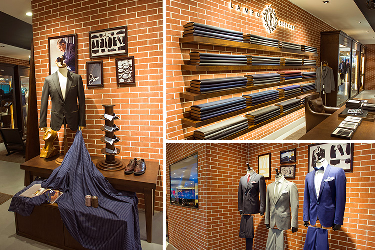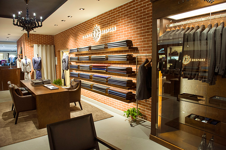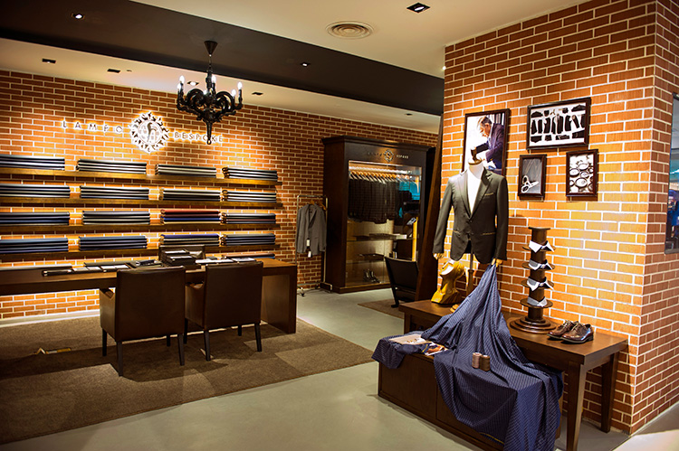 在设计方面,LAMPO BESPOKE上海旗舰店首次打破纯黑色的整体基调,经过创始人吴建卫先生多次修改,最终保留了锦江商厦红砖设计,“执着的完美主义者”吴建卫先生用这样的方式表达对这座百年建筑(建于二十世纪20年代)的尊敬。同时为匹配外里面风格,更将红砖设计用到店内风格的打造上,延续墙体、砖体颜色、花纹的一致。达到这个目标的过程是艰难的,LAMPO蓝豹不得不聘请工匠手工刻模烧砖,然后空运至上海,才得以呈现如今的店厅形象。当巨大的火焰豹LOGO印记在建筑物之外,有人说此时的锦江商厦才终于找到了自我定位,开始散发他悠久的历史感与现代时尚交错迷人气息,像每一个热爱LAMPO蓝豹的男人,“表面温文尔雅,内心充满企图”。